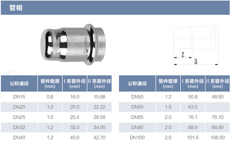 管帽丨材質(Grade): 304/304L、316L 丨原料來源(Source of raw materials): 全部符合相關國家標準要求,用料來源酒鋼、太鋼、張浦、東特等 丨焊接方式(Welding method): 氬弧焊或等離子焊(TIG OR PLASMA在線)+氬弧焊(TIG離線) 丨執行標準(Executive standard): GB/T 19228.2-2011 GB/T12771 丨參數對照表(Parameters):