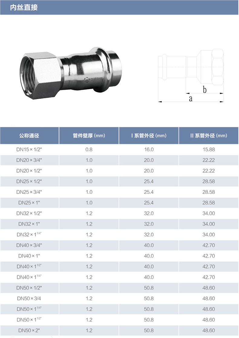 內絲直接丨材質(Grade): 304/304L、316L 丨原料來源(Source of raw materials): 全部符合相關國家標準要求,用料來源酒鋼、太鋼、張浦、東特等 丨焊接方式(Welding method): 氬弧焊或等離子焊(TIG OR PLASMA在線)+氬弧焊(TIG離線) 丨執行標準(Executive standard): GB/T 19228.2-2011 GB/T12771 丨參數對照表(Parameters):